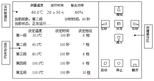 3. 運(yùn)行設(shè)定區(qū):長(zhǎng)按設(shè)定鍵2秒后,該區(qū)第一段的設(shè)定溫度欄顯示為白底藍(lán)字,即進(jìn)入了設(shè)定狀態(tài);該狀態(tài)下,可用左移、右移鍵或減小、增加鍵對(duì)各參數(shù)進(jìn)行設(shè)定;設(shè)定完成后,再長(zhǎng)按設(shè)定鍵退出。